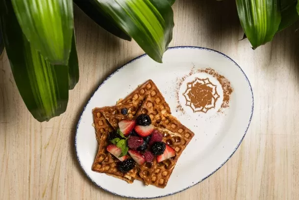 Ricos waffles salseados con maple acompañados de frutos rojos.
