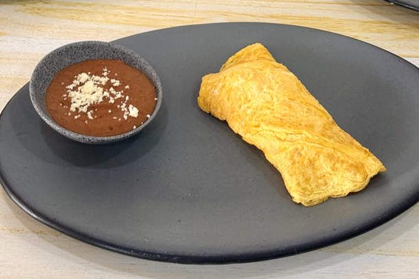 Delicioso omelette de queso, acompañado de frijoles refritos.