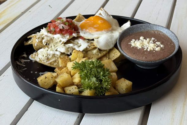 Totopos bañados en salsa de guajillo, crema y queso, acompañados con huevos estrellados, frijoles y papa country.