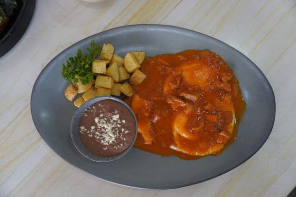 Huevos estrellados bañados en salsa ranchera, acompañados con frijoles y papa country.