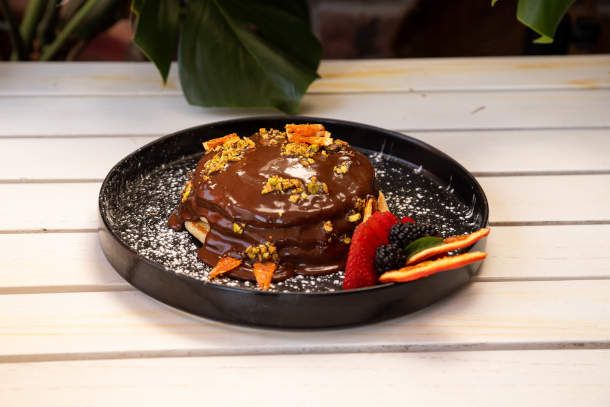 Pancakes con salsa de ganache de chocolate, polvo de pistache y naranja confitada