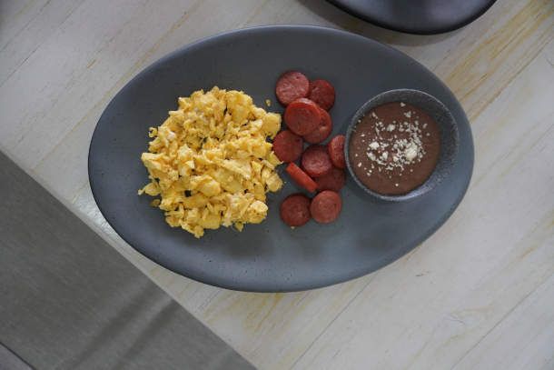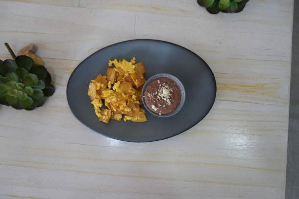 Huevos revueltos acompañados de frijoles refritos.
