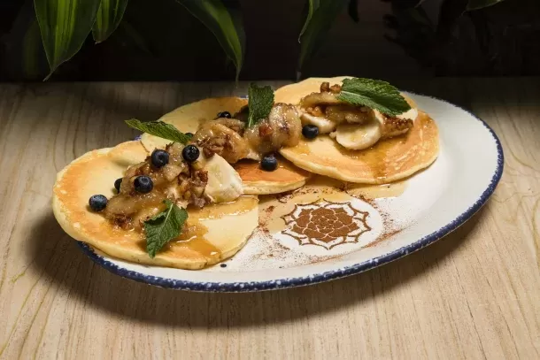 Pancakes con salsa de dulce de leche, polvo de platano y nuez