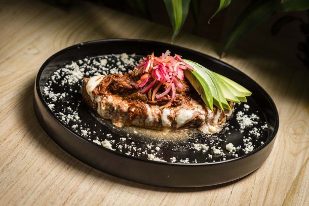 Deliciosas quesadillas fritas rellenas de nuestra emblemática birria, acompañadas de consomé y cebolla en curtida.